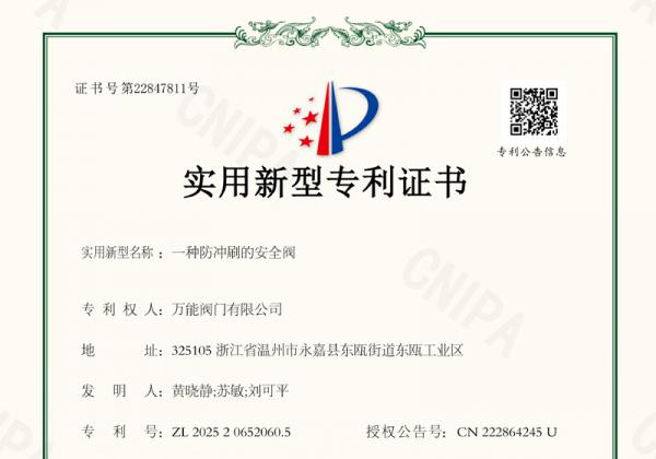近日,萬能閥門有限公司在安全閥技術領域再添新果,其研發的一種“防沖刷的安全閥”成功獲得國家知識產權局實用新型專利授權,專利號為 ZL 2025 2 0652060.5,授權公告號 CN 222864245 U。該項成果的取得不僅展現了企業在閥門防護技術上的深厚積累,也為下游用戶解決了長期以來的設備沖刷損壞難題,進一步提升了安全閥產品的使用壽命與運行穩定性。